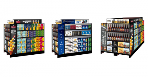 The design of the display unit allows different breweries to advertise promotions, as illustrated in the photo below of a special offer for Unibroue. In addition, outlets can also use the space to promote products frequently purchased with beer, for example, potato chips.